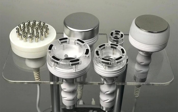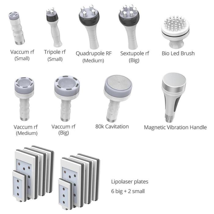 Inclus un applicateur de Cavitation 80Khz avec transducteur de puissance avec augmentation du céramique que favorise la capacité de générer de la pression et des bulles au tissu, apportant une grande efficacité.
